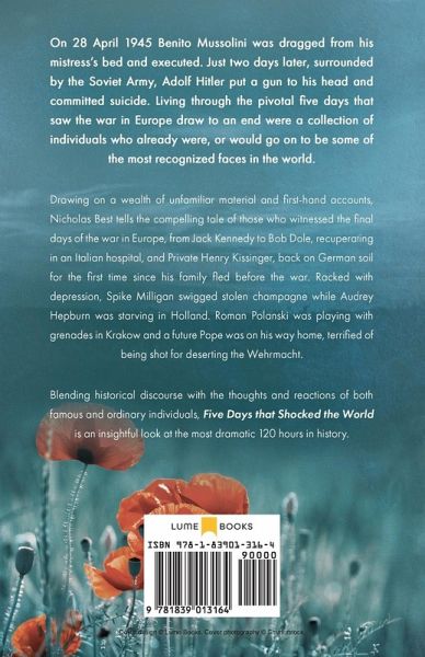 'A gripping account of the last days of World War II... It reads like a thriller, informs like a scholar and is not to be missed.' - Randall Hansen, author of Fire and Fury: The Allied Bombing of Germany 1942-45 On 28 April 1945 Benito Mussolini was dragged from his mistress's bed and executed. Just two days later, surrounded by the Soviet Army, Adolf Hitler put a gun to his head and committed suicide. Living through the pivotal five days that saw the war in Europe draw to an end were a collection of individuals who already were, or would go on to be some of the most recognized faces in the world. Drawing on a wealth of unfamiliar material and first-hand accounts, Nicholas Best tells the compelling tale of those who witnessed the final days of the war in Europe, from Jack Kennedy to Bob Dole, recuperating in an Italian hospital, and Private Henry Kissinger, back on German soil for the first time since his family fled before the war. Racked with depression, Spike Milligan swigged stolen champagne while Audrey Hepburn was starving in Holland. Roman Polanski was playing with grenades in Krakow and a future Pope was on his way home, terrified of being shot for deserting the Wehrmacht. Blending historical discourse with the thoughts and reactions of both famous and ordinary individuals, Five Days that Shocked the World is an insightful look at the most dramatic 120 hours in history.