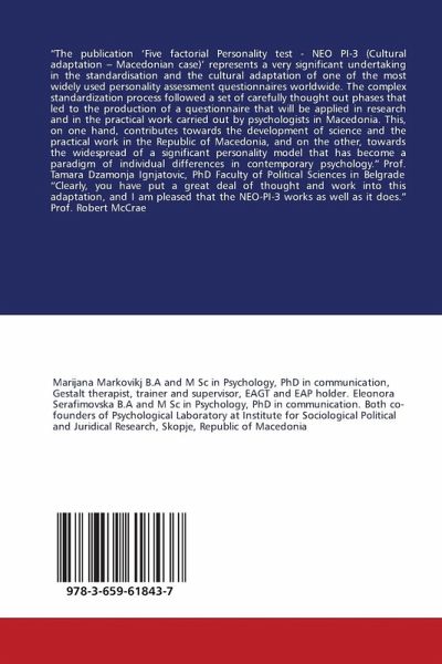 "The publication 'Five factorial Personality test - NEO PI-3 (Cultural adaptation - Macedonian case)' represents a very significant undertaking in the standardisation and the cultural adaptation of one of the most widely used personality assessment questionnaires worldwide. The complex standardization process followed a set of carefully thought out phases that led to the production of a questionnaire that will be applied in research and in the practical work carried out by psychologists in Macedonia. This, on one hand, contributes towards the development of science and the practical work in the Republic of Macedonia, and on the other, towards the widespread of a significant personality model that has become a paradigm of individual differences in contemporary psychology." Prof. Tamara Dzamonja Ignjatovic, PhD Faculty of Political Sciences in Belgrade "Clearly, you have put a great deal of thought and work into this adaptation, and I am pleased that the NEO-PI-3 works as well as it does." Prof. Robert McCrae