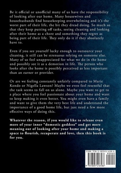 Be it official or unofficial many of us have the responsibility of looking after our home. Many housewives and househusbands find housekeeping overwhelming and it's the worst part of their life, the bit they dread doing. So much so that they keep putting off tasks, seeing cleaning and looking after their home as a chore and something they regret as being part of their life. They only do it if they absolutely have to. Even if you see yourself lucky enough to outsource your cleaning, it still can be strenuous relying on someone else. Many of us feel unappreciated for what we do in the home and possibly see it as a demotion in life. The person who looks after the home is possibly perceived as less important than an earner or provider. Or are we feeling constantly unfairly compared to Marie Kondo or Nigella Lawson? Maybe we even feel resentful that the task seems to fall on us alone. Maybe you want to get to a place where you feel passionate about your home and want to keep making it even better. You might even have a family and want to give them the very best life and understand the importance of a good home life, but just need a few more effective ways of doing this. Whatever the reason, if you would like to release even more of your inner "domestic goddess" and get more meaning out of looking after your home and making a space to flourish, recuperate and love, then this book is for you.