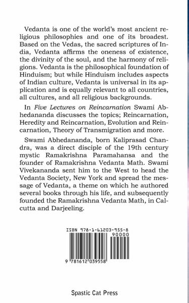 Vedanta is one of the world's most ancient religious philosophies and one of its broadest. Based on the Vedas, the sacred scriptures of India, Vedanta affirms the oneness of existence, the divinity of the soul, and the harmony of religions. Vedanta is the philosophical foundation of Hinduism; but while Hinduism includes aspects of Indian culture, Vedanta is universal in its application and is equally relevant to all countries, all cultures, and all religious backgrounds. In Five Lectures on Reincarnation Swami Abhedananda discusses the topics; Reincarnation, Heredity and Reincarnation, Evolution and Reincarnation, Theory of Transmigration and more. Swami Abhedananda, born Kaliprasad Chandra, was a direct disciple of the 19th century mystic Ramakrishna Paramahansa and the founder of Ramakrishna Vedanta Math. Swami Vivekananda sent him to the West to head the Vedanta Society, New York and spread the message of Vedanta, a theme on which he authored several books through his life, and subsequently founded the Ramakrishna Vedanta Math, in Calcutta (now Kolkata) and Darjeeling.