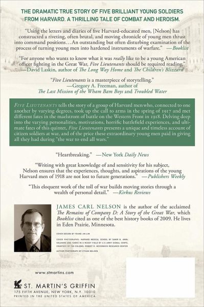 James Carl Nelson tells the dramatic true story of five brilliant young soldiers from Harvard, a thrilling tale of combat and heroism in the First World War. Five Lieutenants tells the story of five young Harvard men who took up the call to arms in the spring of 1917 and met differing fates in the maelstrom of battle on the Western Front in 1918. Delving deep into the motivations, horrific experiences, and ultimate fates of this Harvard-educated quintet-and by extension of the brilliant young officer class that left its collegiate and post-collegiate pursuits to enlist in the Army and lead America's rough-and-ready doughboys-Five Lieutenants presents a unique, timeless, and fascinating account of citizen soldiers at war, and of the price these extraordinary men paid while earnestly giving all they had in an effort to end "the war to end all wars." Drawing upon the subjects' intimate, eloquent, and uncensored letters and memoirs, this is a fascinating microcosm of the American experience in the World War One, and of the horrific experiences and hardships of the educated class of young men who were relied upon to lead doughboys in the trenches and, ultimately, in open battle.