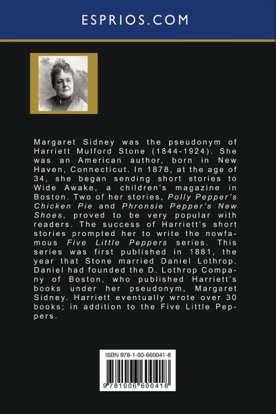 Margaret Sidney was the pseudonym of Harriett Mulford Stone (1844-1924). She was an American author, born in New Haven, Connecticut. In 1878, at the age of 34, she began sending short stories to Wide Awake, a children's magazine in Boston. Two of her stories, Polly Pepper's Chicken Pie and Phronsie Pepper's New Shoes, proved to be very popular with readers. The success of Harriett's short stories prompted her to write the nowfamous Five Little Peppers series. This series was first published in 1881, the year that Stone married Daniel Lothrop. Daniel had founded the D. Lothrop Company of Boston, who published Harriett's books under her pseudonym, Margaret Sidney. Harriett eventually wrote over 30 books; in addition to the Five Little Peppers.