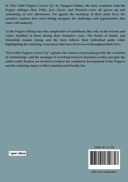 Texte à corriger : "Five Little Peppers Grown Up" by Margaret Sidney continues the story of the Pepper family, focusing on the passage de l'enfance à l'âge adulte. The narrative begins with Polly Pepper, who is now a music teacher at Miss Salisbury's school. She faces the challenge of balancing her professional responsibilities with personal commitments, such as helping her student, Amy Loughead, prepare for her brother's visit. The story unfolds with the Peppers preparing for Christmas, a time filled with both joy and challenges. Phronsie, the youngest Pepper, is determined to have a Christmas tree for Baby Fisher, despite the logistical difficulties. The family also plans their annual visit to Dunraven Lodge, where they bring Christmas cheer to less fortunate children. The narrative highlights the importance of family, love, and community, as the Peppers navigate various obstacles, including a forgotten box of dolls and Joel's unexpected absence. The story is rich with themes of generosity, responsibility, and the enduring bonds of family. As the Peppers grow up, they learn to manage their individual aspirations while maintaining their close-knit family ties. The novel captures the essence of the Pepper family's spirit, showcasing their resilience and commitment to each other and those around them.
