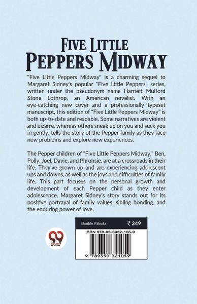 "Five Little Peppers Midway" is a charming sequel to Margaret Sidney's popular "Five Little Peppers" series, written under the pseudonym name Harriett Mulford Stone Lothrop, an American novelist. With an eye-catching new cover and a professionally typeset manuscript, this edition of "Five Little Peppers Midway" is both up-to-date and readable. Some narratives are violent and bizarre, whereas others sneak up on you and suck you in gently. tells the story of the Pepper family as they face new problems and explore new experiences. The Pepper children of "Five Little Peppers Midway," Ben, Polly, Joel, Davie, and Phronsie, are at a crossroads in their life. They've grown up and are experiencing adolescent ups and downs, as well as the joys and difficulties of family life. This part focuses on the personal growth and development of each Pepper child as they enter adolescence. Margaret Sidney's story stands out for its positive portrayal of family values, sibling bonding, and the enduring power of love.