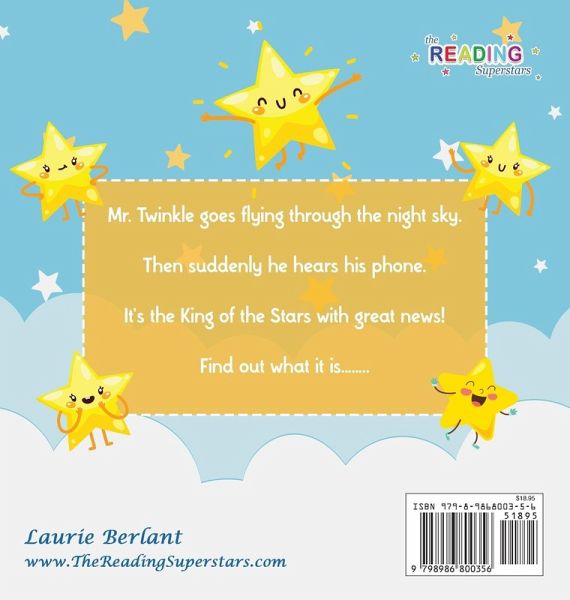 A fun and interactive bedtime story based on the classic 'Twinkle Twinkle Little Star'. Five Little Twinkle Stars ask their mom for a bedtime story. She tells them to 'snuggle in' and begins a fun rhyming story about how they came to be. One night, their dad, Mr. Twinkle, goes flying through the night sky... Suddenly, he hears his phone. It is the King of the Stars with great and very special news! Find out what the King of the Stars tells Mr. Twinkle.