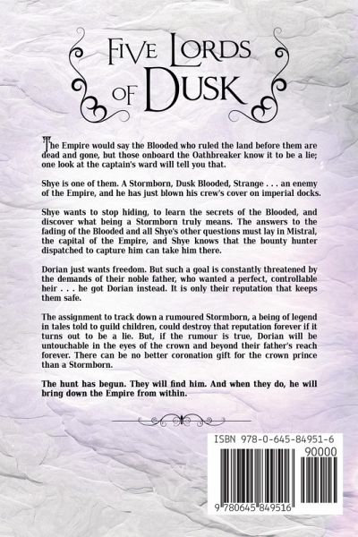 ***Updated 2024: Cover re-design, character list, and revised prologue*** The hunt has begun. They will find him. And when they do, he will bring down the Empire from within. The Empire would say the Blooded who ruled the land before them are dead and gone, but those onboard the Oathbreaker know it to be a lie; one look at the captain's ward will tell you that. Shye is one of them. A Stormborn, Dusk Blooded, Strange . . . an enemy of the Empire, and he has just blown his crew's cover on imperial docks. Shye wants to stop hiding, to learn the secrets of the Blooded, and discover what being a Stormborn truly means. The answers to the fading of the Blooded and all Shye's other questions must lay in Mistral, the capital of the Empire, and Shye knows that the bounty hunter dispatched to capture him can take him there. Dorian just wants freedom. But such a goal is constantly threatened by the demands of their noble father, who wanted a perfect, controllable heir . . . he got Dorian instead. It is only their reputation that saves them from his reach. The assignment to track down a rumoured Stormborn, a being of legend in tales told to guild children, could destroy that reputation forever if it turns out to be a lie. But, if the rumour is true, Dorian will be untouchable in the eyes of the crown and beyond their father's reach forever. There can be no better coronation gift for the crown prince than a Stormborn. Five Lords of Dusk is the debut queer fantasy novel by indie author F. Malbeck. Featuring a genderqueer lead and a flintlock fantasy setting, this novel takes place in a world partly inspired by the author's home country of Australia, as well as the long legacy of epic fantasy literature that precedes it. Fans of Linsey Miller's Mask of Shadows duology and other queer fantasy novels may find a satisfying new adventure in Five Lords of Dusk and the Dusk Lords series.