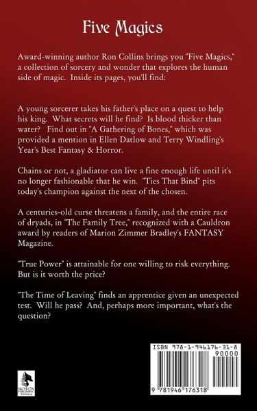 Award-winning author Ron Collins brings you "Five Magics," a collection of sorcery and wonder that explores the human side of magic. Inside its pages, you'll find: A young sorcerer takes his father's place on a quest to help his king. What secrets will he find? Is blood thicker than water? Find out in "A Gathering of Bones," which was provided a mention in Ellen Datlow and Terry Windling's Year's Best Fantasy & Horror. Chains or not, a gladiator can live a fine enough life until it's no longer fashionable that he win. "Ties That Bind" pits today's champion against the next of the chosen. A centuries-old curse threatens a family, and the entire race of dryads, in "The Family Tree," recognized with a Cauldron award by readers of Marion Zimmer Bradley's FANTASY Magazine. "True Power" is attainable for one willing to risk everything. But is it worth the price? "The Time of Leaving" finds an apprentice given an unexpected test. Will he pass? And, perhaps more important, what's the question?