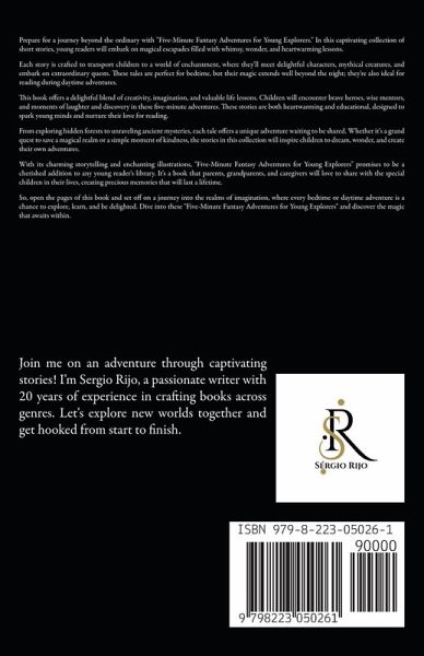 Prepare for a journey beyond the ordinary with "Five-Minute Fantasy Adventures for Young Explorers." In this captivating collection of short stories, young readers will embark on magical escapades filled with whimsy, wonder, and heartwarming lessons. Each story is crafted to transport children to a world of enchantment, where they'll meet delightful characters, mythical creatures, and embark on extraordinary quests. These tales are perfect for bedtime, but their magic extends well beyond the night; they're also ideal for reading during daytime adventures. This book offers a delightful blend of creativity, imagination, and valuable life lessons. Children will encounter brave heroes, wise mentors, and moments of laughter and discovery in these five-minute adventures. These stories are both heartwarming and educational, designed to spark young minds and nurture their love for reading. From exploring hidden forests to unraveling ancient mysteries, each tale offers a unique adventure waiting to be shared. Whether it's a grand quest to save a magical realm or a simple moment of kindness, the stories in this collection will inspire children to dream, wonder, and create their own adventures. With its charming storytelling and enchanting illustrations, "Five-Minute Fantasy Adventures for Young Explorers" promises to be a cherished addition to any young reader's library. It's a book that parents, grandparents, and caregivers will love to share with the special children in their lives, creating precious memories that will last a lifetime. So, open the pages of this book and set off on a journey into the realms of imagination, where every bedtime or daytime adventure is a chance to explore, learn, and be delighted. Dive into these "Five-Minute Fantasy Adventures for Young Explorers" and discover the magic that awaits within.