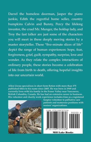 Darrel the homeless doorman, Jasper the piano junkie, Edith the regretful home seller, country bumpkins Calvin and Bunny, Percy the lifelong inventor, the cruel Mr. Munger, the holdup lady and Troy the fast talker are just some of the characters you will meet in these deeply moving stories by a master storyteller. These "five-minute slices of life" depict the range of human experiences: hope, fear, forgiveness, grief, guilt, sympathy, surprise, love and wonder. As they relate the complex interactions of ordinary people, these stories become a celebration of life from birth to death, offering hopeful insights into our uncertain world. Reading them is like sitting down over coffee and dessert and sharing stories with a good friend.