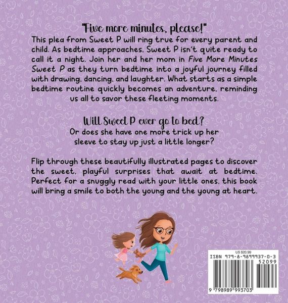 Dive into the charming world of Five More Minutes Sweet P, a delightful tale of a little girl's inventive ways to postpone bedtime. Every parent knows the drill: it's bedtime, but your little one has other ideas! In this heartwarming story, Sweet P and her mom navigate the all-too-familiar bedtime dance with giggles and games. From drawing to dancing, and even a playful chase, each page is a celebration of those precious, playful moments that parents and children cherish. Whether it's scribbling with crayons, prancing around the room, or singing a sweet lullaby, Sweet P's bedtime is anything but boring. Perfect for a cozy read before bed, this book is a wonderful reminder to enjoy every minute with our little ones - even if it's just for five more minutes.