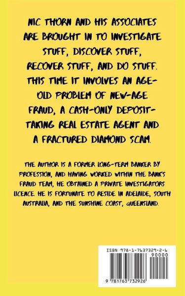 This is the fifth book in the Nic Thorn & Associates series. This time Nic and the team are brought in to investigate the age-old scam of scamming the State Government's old age portfolio. The team base themselves in Sydney but when the fan gets covered with the brown smelly stuff they head back into Brisbane asap to shut down the fraudster. Meantime, one of their lesser-liked associates gets herself involved in a Real Estate Agency scam where the bonds are handed over in cash. It doesn't make sense to the team, but what their friend Dimond gets involved in only ever makes sense to her. Finally, the team investigates a questionable diamond prize, but getting stranded in Dubai on the way to South Africa was never in the plan. Nic Thorn is the go-to guy and is available to travel around Australia busting scams, frauds and genuine misunderstandings with his crew of sidekicks including his computer geek, Chewy, and a couple of damsels that are no longer in distress. Nic is known as being a cross between Batman with access to cool cars and quirky gadgets, and Superman, being able to jump to a conclusion in a single bound. But could this be the end for Nic Thorn and Associates, and how can the secrets of Nic's past remain a mystery? After all how many secrets can one man keep? For more reading from Nic Thorn and his associates of scam-busting capers also available: One Tricked Phony Rose needed a +1, but not for the usual wedding/party as she was going to a funeral and needed a quiet, unassuming type but when Nic Thorn arrived he coerced Rose and her BFF, Sandy into a series of madcap investigations of scams, frauds, and misunderstandings. These adventures involve a portrait provenance, invoice inaccuracy, and a recycler's relapse, on their travels from Brisbane, Adelaide, to the SA border.Two hurtled Gloves Welcome back to Nic's world of diversions and distractions, which begins on a golden beach in Port Douglas, tracks down to Tasmania, and up to the banks of Brisbane. Nic has to investigate a wedded miss, the misguided pretence of Tiger tracking, and then back to Brisbane to handle some banking bastardry.Three French Bens Nic's friend, Benoit Trudeau, is one-third of the 'Three French Bens'. He has just bought into a high-end restaurant in Melbourne, so he calls Nic to have a look, as the numbers look fishy. Then Nic and his crew head to Rockhampton to help the Queensland Department of Ag look into some cattle duffing, and finally, Sandy has to deal with an old school friend, who has been banking on bending the truth. Four brooding Birds Nic and the team head to Western Australia to investigate reptile smuggling, then the team must stop a scammer from drinking sweet success of wine in Margaret River. Finally, they must look into genuine budgie smugglers west of Broken Hill.Six Geezers Lying This time the team are back in Adelaide as car insurance companies are driven up the wall by bogus claims and 'accidents' Then a national restaurant chain runs a competition where the winners are drawn before the competition is closed, and finally back in Brisbane, Rose believes her Father is in the middle of an art scam. Art is not always art, but fraud is always a fraud.Seven hapless Hoops Organisations continue to look to Nic Thorn and his Associates to sort their stuff out. The wife of Nic's friend goes AWOL and it's a little close to home for Nic to ignore. Then a car vanishes without a trace in Mildura, someone keeps digging up the past in Canberra, and a bogus horse race is gathering pace on Kangaroo Island.