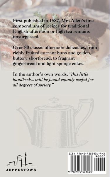 First published in 1887, Mrs Allen's fine compendium of recipes for traditional English afternoon or high tea remains unsurpassed. This book contains directions for making over 80 classic Victorian afternoon delicacies, from richly fruited currant buns and golden, buttery shortbread, to fragrant gingerbread and light sponge cakes.