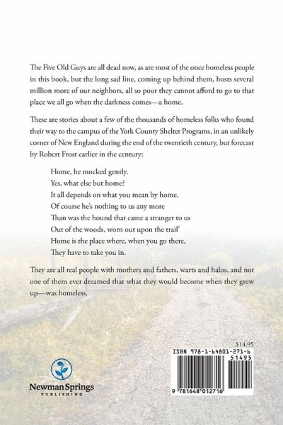 The Five Old Guys are all dead now, as are most of the once homeless people in this book, but the long sad line, coming up behind them, hosts several million more of our neighbors, all so poor they cannot afford to go to that place we all go when the darkness comes-a home. These are stories about a few of the thousands of homeless folks who found their way to the campus of the York County Shelter Programs, in an unlikely corner of New England during the end of the twentieth century, but forecast by Robert Frost earlier in the century: Home, he mocked gently. Yes, what else but home? It all depends on what you mean by home. Of course he's nothing to us any more Than was the hound that came a stranger to us Out of the woods, worn out upon the trail' Home is the place where, when you go there, They have to take you in. They are all real people with mothers and fathers, warts and halos, and not one of them ever dreamed that what they would become when they grew up-was homeless.