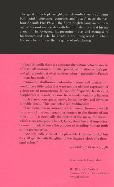 The great French playwright Jean Anouilh (1910-87) wrote both "pink" bittersweet comedies and "black" tragic dramas. "Jean Anouilh Five Plays"--the finest English-language anthology of his works--crackles with both his sharp wit and his icy cynicism. In "Antigone," his preeminent play and exemplar of his themes and style, he creates a disturbing world in which fate may be no more than a game of role-playing. "Eurydice," " The Ermine," "The Rehearsal," R"omeo and Jeannette" are the other plays included in this edition.