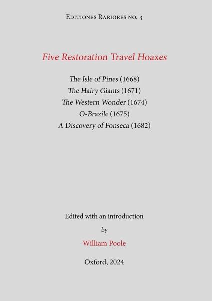 This edition presents five English travel hoaxes published between 1668 and 1682. The travel hoax was a popular form of fiction in the English Restoration, with its roots in utopianism, but now expressed as vigorous travel narrative in often rough vernacular prose, a style of writing marked by the rise of pamphlet literature and of the newspaper. These texts -- with varying degrees of skill, and varying degrees of success -- try to trick the reader, to make us believe that these new lands really exist. The first of these hoaxes presented here is now quite well-known: The Isle of Pines (1668), an account of an Elizabethan shipwreck that gave rise to a forgotten English island colony somewhere in the vicinity of the unexplored Australian continent, then rediscovered by the Dutch and the French. But the whole 'discovery' was in fact fabricated by the Republican politician and writer Henry Neville (1620-1694), who was manipulating the form of the fake discovery to conduct a theoretical investigation into the origins of government. Three years later there appeared the now almost unknown The Hairy Giants, authorship still mysterious. This claimed to be in origin a Dutch narrative of exploration, but this time encasing a tale of an initial Portuguese shipwreck in giant-infested South America, where the Portuguese narrator marries into the local giant dynasty, and settles there. Next come two texts by the Anglo-Irish writer Richard Head (c. 1637-1686?), The Western Wonder (1674) and O-Brazile (1675), accounts that approach in different ways the Irish legend of 'Hy Brasil', the fabled appearing-and-disappearing island off the coast of Ireland. Finally there is A Discovery of Fonseca (1682), surviving today in just one copy, pretending to be a Dutch epistolary account of a voyage involving both English and Dutch crew. Shipwreck off the South American coast near the river Orinoco leads to the discovery of a society of solely women -- all speaking Welsh. These are all artfully artless narratives, in which energy has been expended not on a smooth and obviously literary style, but on the hoaxer's rougher verisimilitude. Such texts confront their readers with questions of what is truth, and how we are to identify it. They also remind us that many of the 'real' travel narratives of the time contained much material that might be suspected, or indeed soon came to be identified, as fantastical. But where do we draw the line, these texts ask, and who has the skill to draw it truly?