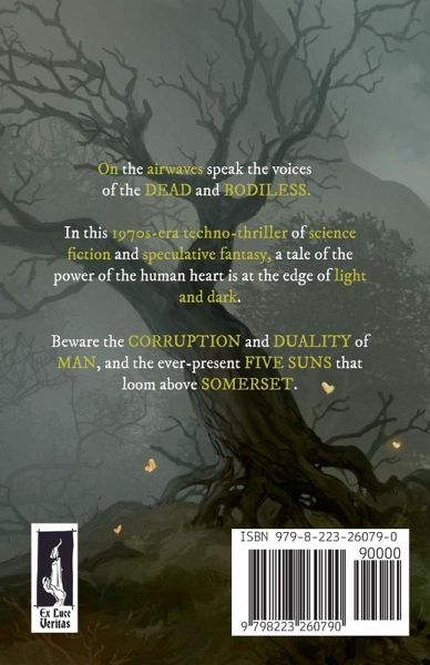 On the airwaves speak the voices of the dead and bodiless. Former architect Harry Chamberlain's young daughter has been kidnapped. His search for her will take him across not only Somerset county, but the very edge of reality. The road to saving his daughter is paved with the bones of failure, and with 1970s Britain as the backdrop to this retro-techno-thriller, Five Suns Over Somerset offers glimpses of the tenacity of the human heart at the edge of light and dark. Beware the CORRUPTION and DUALITY of MAN and the ever-present FIVE SUNS that loom above SOMERSET. The cosmic clock ticks on. Tick.