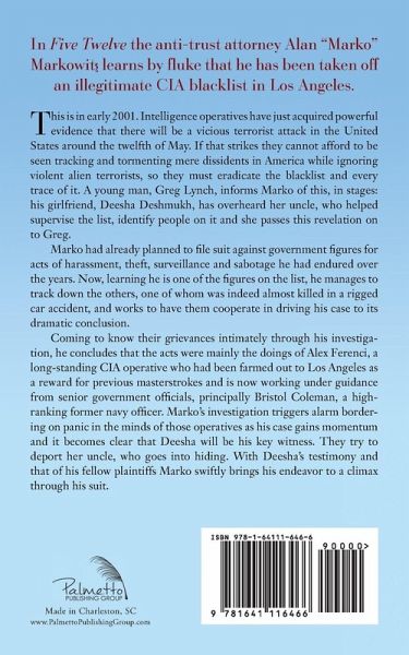 This is in early 2001. Intelligence operatives have just acquired powerful evidence that there will be a vicious terrorist attack in the United States around the twelfth of May. If that strikes they cannot afford to be seen tracking and tormenting mere dissidents in America while ignoring violent alien terrorists, so they must eradicate the blacklist and every trace of it. A young man, Greg Lynch, informs Marko of this, in stages: his girlfriend, Deesha Deshmukh, has overheard her uncle, who helped supervise the list, identify people on it and she passes this revelation on to Greg. Marko had already planned to file suit against government figures for acts of harassment, theft, surveillance and sabotage he had endured over the years. Now, learning he is one of the figures on the list, he manages to track down the others, one of whom was indeed almost killed in a rigged car accident, and works to have them cooperate in driving his case to its dramatic conclusion. Coming to know their grievances intimately through his investigation, he concludes that the acts were mainly the doings of Alex Ferenci, a long-standing CIA operative who had been farmed out to Los Angeles as a reward for previous masterstrokes and is now working under guidance from senior government officials, principally Bristol Coleman, a high ranking former navy officer. Marko’s investigation triggers alarm bordering on panic in the minds of those operatives as his case gains momentum and it becomes clear that Deesha will be his key witness. They try to deport her uncle, who goes into hiding. With Deesha’s testimony and that of his fellow plaintiffs Marko swiftly brings his endeavor to a climax through his suit.