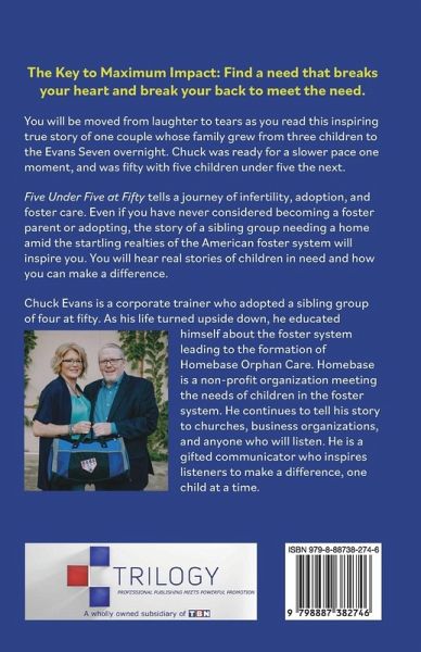 The Key to Maximum Impact: Find a need that breaks your heart and break your back to meet the need. You will be moved from laughter to tears as you read this inspiring true story of one couple whose family grew from three children to the Evans Seven overnight. Chuck was ready for a slower pace one moment, and was fifty with five children under five the next. Five Under Five at Fifty tells a journey of infertility, adoption, and foster care. Even if you have never considered becoming a foster parent or adopting, the story of a sibling group needing a home amid the startling realties of the American foster system will inspire you. You will hear real stories of children in need and how you can make a difference.