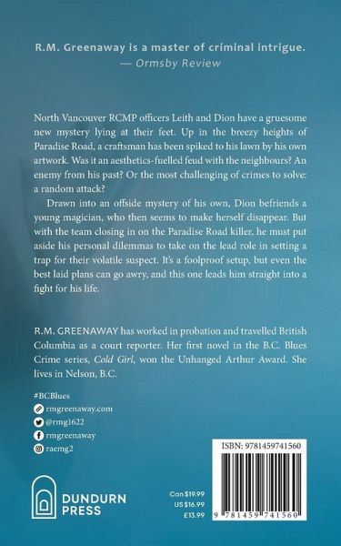 R.M. Greenaway has worked in probation and travelled British Columbia as a court reporter. Her first novel in the B.C. Blues Crime series, Cold Girl, won the Unhanged Arthur Ellis Award. She lives in Nelson, B.C.