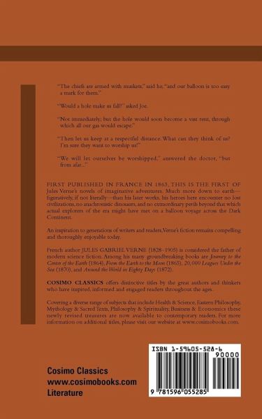 "The chiefs are armed with muskets," said he, "and our balloon is too easy a mark for them." "Would a hole make us fall?" asked Joe. "Not immediately; but the hole would soon become a vast rent, through which all our gas would escape." "Then let us keep at a respectful distance. What can they think of us? I'm sure they want to worship us!" "We will let ourselves be worshipped," answered the doctor, "but from afar..." 13.5013.5013.50 First published in France in 1863, this is the first of Jules Verne's novels of imaginative adventures. Much more down to earth-figuratively, if not literally-than his later works, his heroes here encounter no lost civilizations, no anachronistic dinosaurs, and no extraordinary perils beyond that which actual explorers of the era might have met on a balloon voyage across the Dark Continent. An inspiration to generations of writers and readers, Verne's fiction remains compelling and thoroughly enjoyable today. French author JULES GABRIEL VERNE (1828-1905) is considered the father of modern science fiction. Among his many groundbreaking books are Journey to the Center of the Earth (1864), From the Earth to the Moon (1865), 20,000 Leagues Under the Sea (1870), and Around the World in Eighty Days (1872).