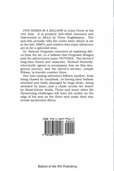 FIVE WEEKS IN A BALLOON is Jules Verne at his very best. It is properly sub-titled Journeys and Discoveries in Africa by Three Englishmen. The sub-title actually tells the entire story which is set in the late 1800's, and readers who enjoy adventure are in for a splendid treat. Dr. Samuel Ferguson conceives of exploring Africa from the air, in a balloon that Ferguson designs and the adventurers name VICTORIA. The doctor's long-time friend and associate, Richard Kennedy, reluctantly agrees to accompany him on this dangerous journey, and the doctor's servant, Joseph Wilson, is traveler number three. One hair-raising adventure follows another, from being chased by cannibals...to having their balloon attacked and badly damaged by huge birds...being attacked by lions...and a chase across the desert by blood-thirsty Arabs. These and many other life threatening challenges will have the reader on the edge of his seat as the three men make their way across mysterious Africa.