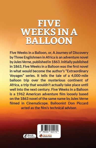 Five Weeks in a Balloon, or, A Journey of Discovery by Three Englishmen in Africa is an adventure novel by Jules Verne, published in 1863. Initially published in 1863, Five Weeks in a Balloon was the first novel in what would become the author's "Extraordinary Voyages" series. It tells the tale of a 4,000-mile balloon trip over the mysterious continent of Africa, a trip that wouldn't actually take place until well into the next century. Five Weeks in a Balloon is a 1962 American adventure film loosely based on the 1863 novel of the same name by Jules Verne filmed in CinemaScope. Balloonist Don Piccard acted as the film's technical advisor.