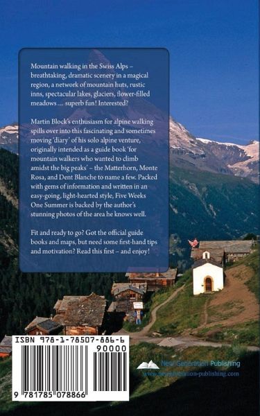 Mountain walking in the Swiss Alps - breathtaking, dramatic scenery in a magical region, a network of mountain huts, rustic inns, spectacular lakes, glaciers, flower-filled meadows... super fun! Interested? Martin Block's enthusiasm for alpine walking spills over into this fascinating and sometimes moving 'diary' of his solo alpine venture, originally intended as a guide book 'for mountain walkers who wanted to climb amidst the big peaks' - the Matterhorn, Monte Rosa, and Dent Blanche to name a few. Packed with gems of information and written in an easy-going, light-hearted style, Five Weeks One Summer is backed by the author's stunning photos of the area he knows well. Fit and ready to go? Got the official guide books and maps, but need some first-hand tips and motivation? Read this first - and enjoy!