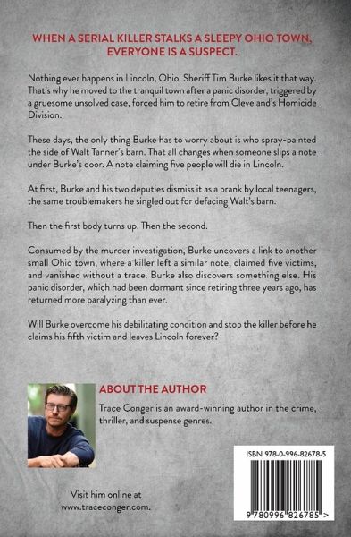 WHEN A SERIAL KILLER STALKS A SLEEPY OHIO TOWN, EVERYONE IS A SUSPECT. Nothing ever happens in Lincoln, Ohio. Sheriff Tim Burke likes it that way. That's why he moved to the tranquil town after a panic disorder, triggered by a gruesome unsolved case, forced him to retire from Cleveland's Homicide Division. These days, the only thing Burke has to worry about is who spray-painted the side of Walt Tanner's barn. That all changes when someone slips a note under Burke's door. A note claiming five people will die in Lincoln. At first, Burke and his two deputies dismiss it as a prank by local teenagers, the same troublemakers he singled out for defacing Walt's barn. Then the first body turns up. Then the second. Consumed by the murder investigation, Burke uncovers a link to another small Ohio town, where a killer left a similar note, claimed five victims, and vanished without a trace. Burke also discovers something else. His panic disorder, which had been dormant since retiring three years ago, has returned more paralyzing than ever. Will Burke overcome his debilitating condition and stop the killer before he claims his fifth victim and leaves Lincoln forever?