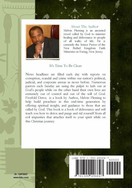 Fivefold Detox is a book by Melvin Fleming inspired to help build preachers in this end-time hour by offering spiritual insight, and guidance to those that are called into the ministry to preach the Gospel. This book is a book of deliverance and will teach preachers how to detox, purge and rid themselves from all evil impurities that attaches itself to their spirit while on this Christian journey.