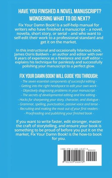 Fix Your Damn Book! is a self-help manual for writers who have finished a manuscript - a novel, novella, short story, or serial - and who want to self-edit their work to a professional standard and get it on the market. In this instructional and occasionally hilarious book, James Osiris Baldwin - an author and editor with over 8 years of experience as a freelance and staff editor - explains his technique for painlessly and successfully polishing your manuscript to a perfect glow. Fix Your Damn Book! will guide you through: - The seven essential components of successful editing - Getting into the right headspace to edit your own work - Objectively diagnosing problems in your manuscript - The secrets of developmental editing and line editing - Hacks for sharpening your story, character, and dialogue - Grammar, spelling, punctuation, passive voice and tense - Recruiting and making the most out of your first readers - Proofreading and publishing your finished book