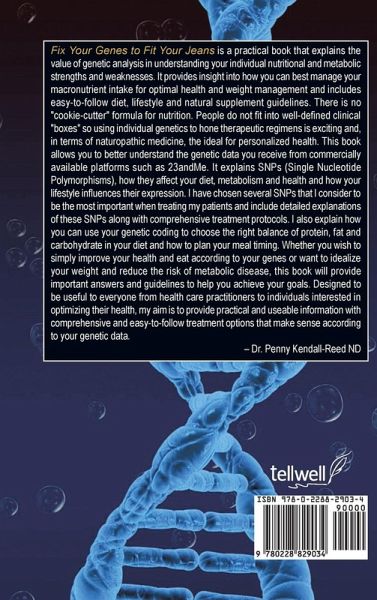Fix Your Genes to Fit Your Jeans is a practical book that explains the value of genetic analysis in understanding your individual nutritional and metabolic strengths and weaknesses. It provides insight into how you can best manage your macronutrient intake for optimal health and weight management and includes easy-to-follow personalized diet, lifestyle and natural supplement guidelines. There is no "cookie-cutter" formula for nutrition. People do not fit into well-defined clinical "boxes" so using individual genetics to hone therapeutic regimens is exciting and, in terms of naturopathic medicine, the ideal for personalized health. This book allows you to better understand the genetic data you receive from commercially available platforms such as 23andMe. It explains SNPs (Single Nucleotide Polymorphisms), how they affect your diet, metabolism and health and how your lifestyle influences their expression. I have chosen several SNPs that I consider to be the most important when treating my patients and include detailed explanations of these SNPs along with comprehensive treatment protocols. I also explain how you can use your genetic coding to choose the right balance of protein, fat and carbohydrate in your diet and how to plan your meal timing. Whether you wish to simply improve your health and eat according to your genes or want to idealize your weight and reduce the risk of metabolic disease, this book will provide important answers and guidelines to help you achieve your goals. Designed to be useful to everyone from health care practitioners to individuals interested in optimizing their health, my aim is to provide practical and useable information with comprehensive and easy-to-follow treatment options that make sense according to your genetic data. - Dr. Penny Kendall-Reed ND