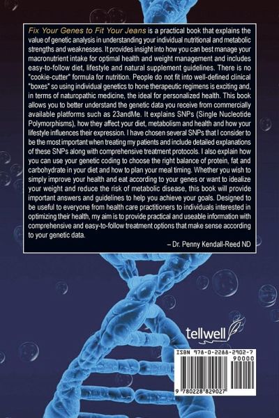 Fix Your Genes to Fit Your Jeans is a practical book that explains the value of genetic analysis in understanding your individual nutritional and metabolic strengths and weaknesses. It provides insight into how you can best manage your macronutrient intake for optimal health and weight management and includes easy-to-follow personalized diet, lifestyle and natural supplement guidelines. There is no "cookie-cutter" formula for nutrition. People do not fit into well-defined clinical "boxes" so using individual genetics to hone therapeutic regimens is exciting and, in terms of naturopathic medicine, the ideal for personalized health. This book allows you to better understand the genetic data you receive from commercially available platforms such as 23andMe. It explains SNPs (Single Nucleotide Polymorphisms), how they affect your diet, metabolism and health and how your lifestyle influences their expression. I have chosen several SNPs that I consider to be the most important when treating my patients and include detailed explanations of these SNPs along with comprehensive treatment protocols. I also explain how you can use your genetic coding to choose the right balance of protein, fat and carbohydrate in your diet and how to plan your meal timing. Whether you wish to simply improve your health and eat according to your genes or want to idealize your weight and reduce the risk of metabolic disease, this book will provide important answers and guidelines to help you achieve your goals. Designed to be useful to everyone from health care practitioners to individuals interested in optimizing their health, my aim is to provide practical and useable information with comprehensive and easy-to-follow treatment options that make sense according to your genetic data. - Dr. Penny Kendall-Reed ND