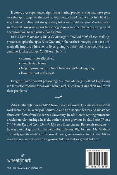 If you've ever experienced significant marital problems, you may have gone to a therapist to get to the root of your conflict and deal with it in a healthy way. But counseling isn't always as helpful as you might imagine. Venting every week about how your spouse has wronged you can supercharge your anger and encourage you to see yourself as a victim. In Fix Your Marriage Without Counseling: A Practical Method Men Will Appreciate, couples therapist Ziba Graham Jr. shares the strategies that have dramatically improved his clients' lives, giving you the tools you need to create genuine, lasting change. You'll learn how to:communicate effectively avoid laying blame help improve your partner's behavior without nagging leave the past in the past Insightful and thought-provoking, Fix Your Marriage Without Counseling is a fantastic resource for anyone who'd rather seek solutions than wallow in their problems.