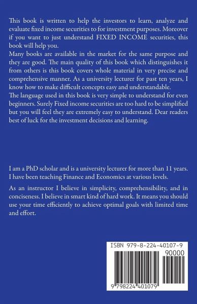 This book is written to help the investors to learn, analyze and evaluate fixed income securities to for investment purposes. Moreover if you want to just understand FIXED INCOME securities, this book will help you. Many books are available in the market for the same purpose and they are good. The main quality of this book which distinguishes it from others is this book covers whole material in very precise and comprehensive manner. As a university lecturer for past ten years, I know how to make difficult concepts easy and understandable. The language used in this book is very simple to understand for even beginners. Surely Fixed income securities are too hard to be simplified but you will feel they are extremely easy to understand. Dear readers best of luck for the investment decisions and learning.