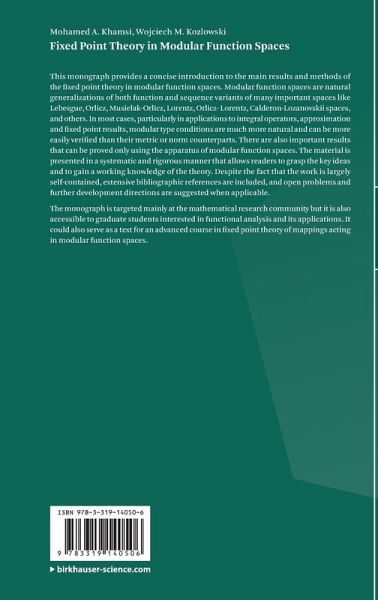 "The book is devoted to a comprehensive treatment of what is currently known about the fixed point theory in modular function spaces. ... the book will be useful for all mathematicians whose interests lie in nonlinear analysis, in particular, in the theory of function spaces and fixed point theory." (Peter P. Zabre ko, zbMATH 1318.47002, 2015)