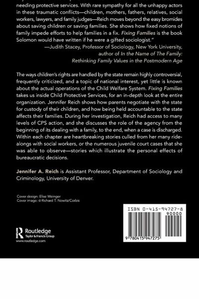In Fixing Families, Jennifer Reich takes us inside Child Protective Services for an in-depth look at the entire organization. Following families from the beginning of a case to its discharge, Reich shows how parents negotiate with the state for custody of their children, and how being held accountable to the state affects a family.