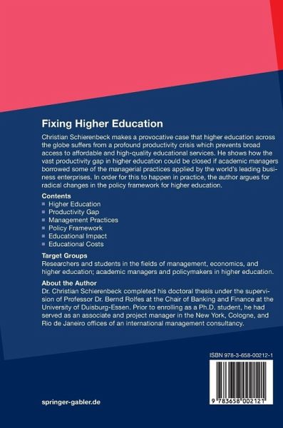Christian Schierenbeck makes a provocative case that higher education across the globe suffers from a profound productivity crisis which prevents broad access to affordable and high-quality educational services. He shows how the vast productivity gap in higher education could be closed if academic managers borrowed some of the managerial practices applied by the world's leading business enterprises. In order for this to happen in practice, the author argues for radical changes in the policy framework for higher education.