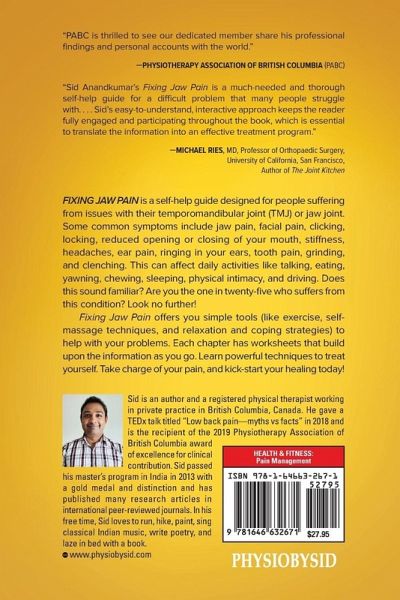 Fixing Jaw Pain is a self-help guide designed for people suffering from issues with their temporomandibular joint (TMJ) or jaw joint. Some common symptoms include jaw pain, facial pain, clicking, locking, reduced opening or closing of your mouth, stiffness, headaches, ear pain, ringing in your ears, tooth pain, grinding, and clenching. This can affect daily activities like talking, eating, yawning, chewing, sleeping, physical intimacy, and driving. Does this sound familiar? Are you the one in twenty-five who suffers from this condition? Look no further! Fixing Jaw Pain offers you simple tools (like exercise, self-massage techniques, and relaxation and coping strategies) to help with your problems. Each chapter has worksheets that build upon the information as you go. Learn powerful techniques to treat yourself. Take charge of your pain, and kick-start your healing today!