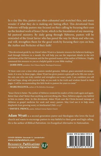 In a day like this, pastors are often exhausted and stretched thin, and many wonder if what they do is making any lasting effect. This devotional from Hebrews will help pastors stay focused on their calling by focusing their eyes on the finished work of Jesus Christ, which is the foundation of any meaningful pastoral ministry. By daily going through Hebrews, pastors will be reminded of the Great Savior who has paved the way for them and who can, and will, strengthen them for the good work by focusing their eyes on him, the Author and Perfector of their faith!