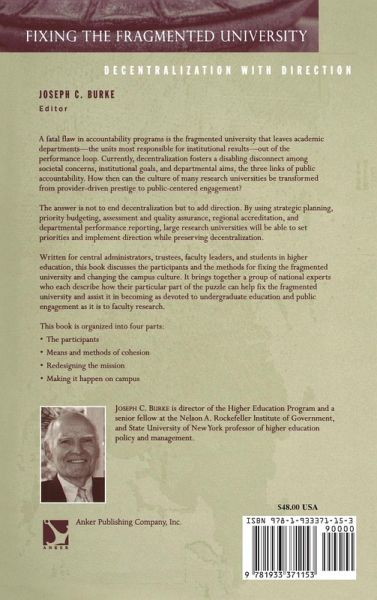 A fatal flaw in accountability programs is the fragmented university that leaves academic departments--the units most responsible for institutional results--out of the performance loop. Currently, decentralization fosters a disabling disconnect among societal concerns, institutional goals, and departmental aims, the three links of public accountability. How then can the culture of many research universities be transformed from provider-driven prestige to public-centered engagement? The answer is not to end decentralization but to add direction. By using strategic planning, priority budgeting, assessment and quality assurance, regional accreditation, and departmental performance reporting, large research universities will be able to set priorities and implement direction while preserving decentralization. Written for central administrators, trustees, faculty leaders, and students in higher education, this book discusses the participants and the methods for fixing the fragmented university and changing the campus culture. It brings together a group of national experts who each describe how their particular part of the puzzle can help fix the fragmented university and assist it in becoming as devoted to undergraduate education and public engagement as it is to faculty research. This book is organized into four parts: * The participants * Means and methods of cohesion * Redesigning the mission * Making it happen on campus