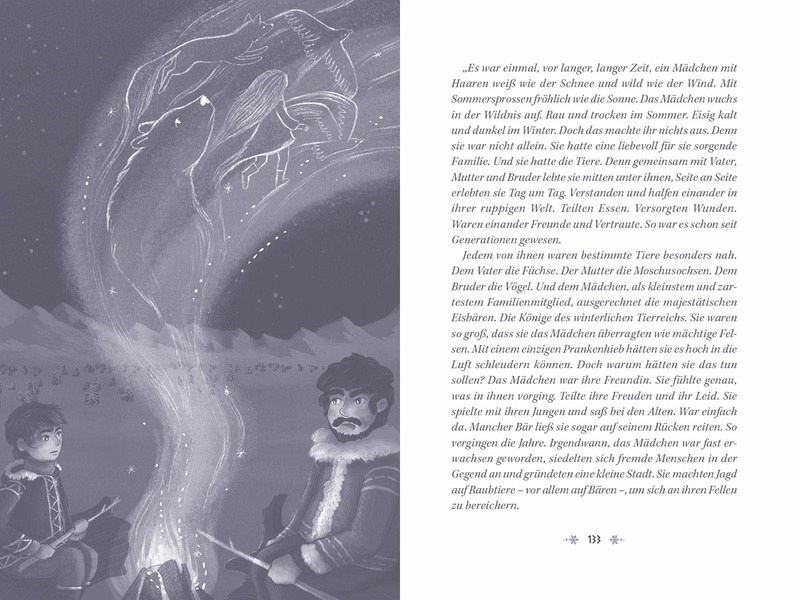 Es war einmal, vor langer, langer Zeit, ein Mädchen mit Haaren weiß wie der Schnee und wild wie der Wind. Mit Sommersprossen fröhlich wie die Sonne. Das Mädchen wuchs in der Wildnis auf. Rau und trocken im Sommer. Eisigkalt und dunkel im Winter. Doch das machte ihr nichts aus. Denn sie war nicht allein.