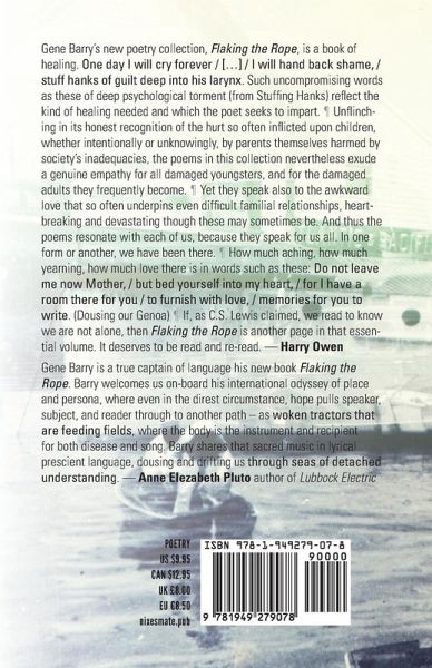 Gene Barry's gift to his readers is a poet's brilliant, courageous, and powerful rendering of family dysfunction, child abuse and sexual molestation. In this exquisite collection of poems, Barry writes with compassion and heart-wrenching expression of 'aged uncleanable stains,' where 'there were zeppelins always knocking around his skyline,' 'belching the dark with upsetness.' In Flaking the Rope, Barry is not afraid to challenge us, layering his poems with wisdom and metaphor as he ventures and navigates his way into the depths of pain and trauma, revealing unconscionable acts and life-altering experiences, and, in the process, illuminating us with intelligent writing and striking word combinations. Gene Barry is a masterful poet, one who truly wants change for this world, an enlightened activist who pens gorgeous poems. Flaking the Rope extends love and forgiveness at its centre, expresses hope of universal healing, where 'a hug is a thesaurus that blankets every wound.' Jeannie E. Roberts, author of The Wingspan of Things, Romp and Ceremony, Beyond Bulrush, Nature of it All and other books.