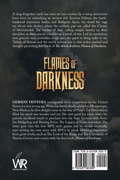 A long-forgotten myth has been set into motion by a rising mysterious force bent on unleashing an ancient evil. Koveras Falkner, the battlehardened mercenary leader, and Bridgette Ayres, the timid fire sage are thrust into destiny where the unlikely pair are called the Chosen of Melchizedek. The burden of their calling weighs heavily on their shoulders as their county crumbles as a result of war. Led by mysterious new generals with forbidden magic arts, the quest to bring order to the Throne of Beimas and the world commences in this action-packed and thought-provoking first book of The Ariah Archives: Flames of Darkness.