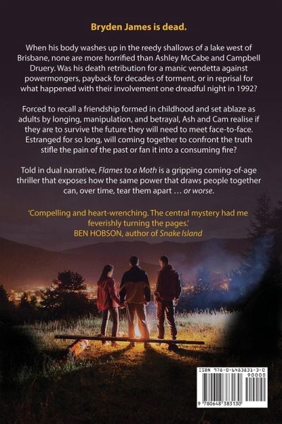 Three friends. Two voices. One terrible secret. Told in dual narrative, Flames to a Moth is a gripping coming-of-age thriller that exposes how the same power that draws people together can, over time, tear them apart ... or worse. Bryden James is dead. When his body washes up in the reedy shallows of a lake west of Brisbane, none are more horrified than Ashley McCabe and Campbell Druery. Was his death retribution for a manic vendetta against powermongers, payback for decades of torment, or in reprisal for what happened with their involvement one dreadful night in 1992? Forced to recall a friendship formed in childhood and set ablaze as adults by longing, manipulation, and betrayal, Ash and Cam realise if they are to survive the future they will need to meet face-to-face. Estranged for so long, will coming together to confront the truth stifle the pain of the past or fan it into a consuming fire? 'Compelling and heart-wrenching. The central mystery had me feverishly turning the pages.' BEN HOBSON, author of Snake Island