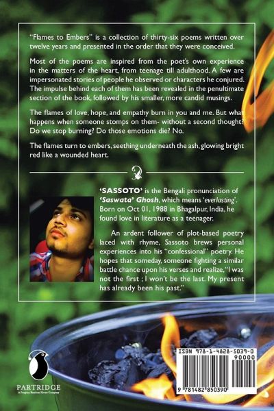 "Flames to Embers" is a collection of thirty-six poems written over twelve years and presented in the order that they were conceived. Most of the poems are inspired from the poet's own experience in the matters of the heart, from teenage till adulthood. A few are impersonated stories of people he observed or characters he conjured. The impulse behind each of them has been revealed in the penultimate section of the book, followed by his smaller, more candid musings. The flames of love, hope, and empathy burn in you and me. But what happens when someone stomps on them- without a second thought? Do we stop burning? Do those emotions die? No. The flames turn to embers, seething underneath the ash, glowing bright red like a wounded heart.