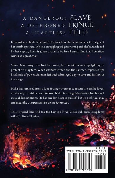 A dangerous slave, a dethroned prince, and a heartless thief. Enslaved as a child, Lark doesn't know where she came from or the origin of her terrible powers. When a smuggling job goes wrong and she's abandoned by her captor, Lark is given a chance to free herself. But that liberation comes at a great cost. Soren Bruun may have lost his crown, but he will never stop fighting to protect his kingdom. When enemies invade and the usurper empress strips his family of power, Soren is left with a besieged city to save and his honor to salvage. Maku has returned from a long journey overseas to rescue the girl he loves, or at least, the girl he used to love. Maku is extinguished-fire has burned away all his emotions. He has one last heist to pull off, but it's a job that may endanger the one person he's trying to protect. Their twisted fates will fan the flames of war. Cities will burn. Kingdoms will fall. Fire will reign.