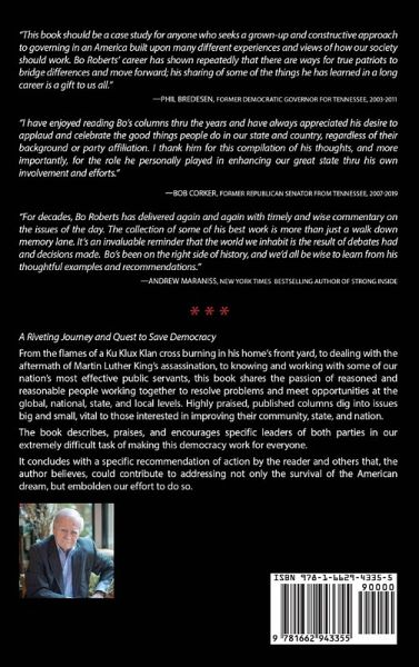 A Riveting Journey and Quest to Save Democracy From the flames of a Ku Klux Klan cross burning in his home's front yard, to dealing with the aftermath of Martin Luther King's assassination, to knowing and working with some of our nation's most effective public servants, this book shares the passion of reasoned and reasonable people working together to resolve problems and meet opportunities at the global, national, state, and local levels. Highly praised, published columns dig into issues big and small, vital to those interested in improving their community, state, and nation. The book describes, praises, and encourages specific leaders of both parties in our extremely difficult task of making this democracy work for everyone. It concludes with a specific recommendation of action by the reader and others that, the author believes, could contribute to addressing not only the survival of the American dream, but embolden our effort to do so.