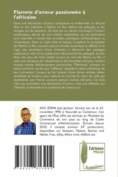Dans une déclaration d'amour audacieuse et enflammée, un africain libre et fier s'adresse à Marine Le Pen, défiant les préjugés et les clivages qui les séparent. Ce livre est un vibrant hommage à l'amour authentique, dénué de tout intérêt matérialiste, où les sentiments sont exprimés à travers des envolées poétiques, philosophiques et romantiques. Dans un style riche et lyrique, il explore la complexité de Marine Le Pen, souvent perçue comme autarcique et difficile. Il ne s'agit pas seulement d'une invitation à découvrir des paysages majestueux, mais d'une quête pour déconstruire les préjugés ancrés. Avec des jeux de mots habiles autour du nom de Marine Le Pen, il crée une mosaïque de métaphores et de proverbes africains, rendant chaque phrase délicieusement provocante. "Marinama" évoque un amour profond, tandis que "LePenya" rappelle la valeur précieuse de leur connexion. L'auteur se fait l'artisan d'une danse verbale, alliant tendresse et humour, pour séduire et toucher le coeur de celle qui représente une France souvent perçue comme lointaine. Ce livre n'est pas seulement une déclaration d'amour; c'est une réflexion sur l'identité, la diversité et la puissance de l'amour pur.