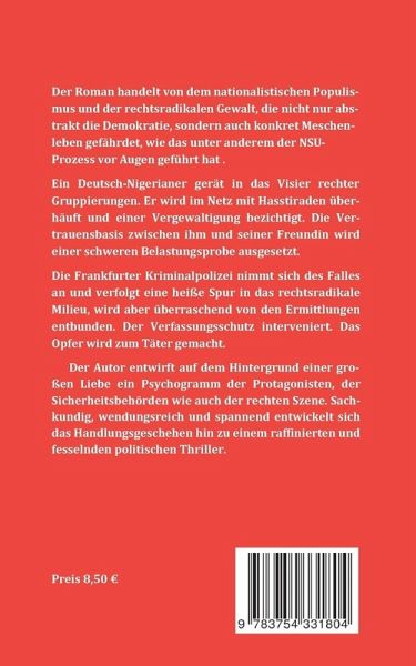 Das Romangeschehen spielt in Frankfurt am Main. Es handelt von dem rechts-nationalistischen Populismus und der rechtsradikalen Gewalt, die nicht nur abstrakt die Demokratie, sondern auch konkret Menschenleben gefährdet, wie das unter anderem der NSU-Prozess vor Augen geführt hat. Die Gesinnungen und Denkweisen rechter Gruppierungen bilden die Folie des Romangeschehens, auf der die individuellen Schicksale, die inneren Konflikte und Befindlichkeiten der Menschen, die zersetzenden Ressentiments ausgesetzt sind, erzählt werden.Die lebenslustige Sine Kühn verliebt sich in den erfolgreichen Arzt…mehr