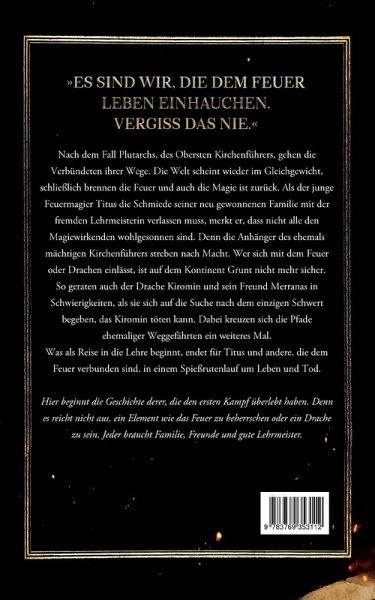 Nach dem Fall Plutarchs, des Obersten Kirchenführers, gehen die Verbündeten ihrer Wege. Die Welt scheint wieder im Gleichgewicht, schließlich brennen die Feuer und auch die Magie ist zurück. Als der junge Feuermagier Titus die Schmiede seiner neu gewonnenen Familie mit der fremden Lehrmeisterin verlassen muss, merkt er, dass nicht alle den Magiewirkenden wohlgesonnen sind. Denn die Anhänger des ehemals mächtigen Kirchenführers streben nach Macht. Wer sich mit dem Feuer oder Drachen einlässt, ist auf dem Kontinent Grunt nicht mehr sicher. So geraten auch der Drache Kiromin und sein Freund Merranas in Schwierigkeiten, als sie sich auf die Suche nach dem einzigen Schwert begeben, das Kiromin töten kann. Dabei kreuzen sich die Pfade ehemaliger Weggefährten ein weiteres Mal. Was als Reise in die Lehre beginnt, endet für Titus und andere, die dem Feuer verbunden sind, in einem Spießrutenlauf um Leben und Tod. »Es sind wir, die dem Feuer Leben einhauchen. Vergiss das nie.« Hier beginnt die Geschichte derer, die den ersten Kampf überlebt haben. Denn es reicht nicht aus, ein Element wie das Feuer zu beherrschen oder ein Drache zu sein. Jeder braucht Familie, Freunde und gute Lehrmeister.